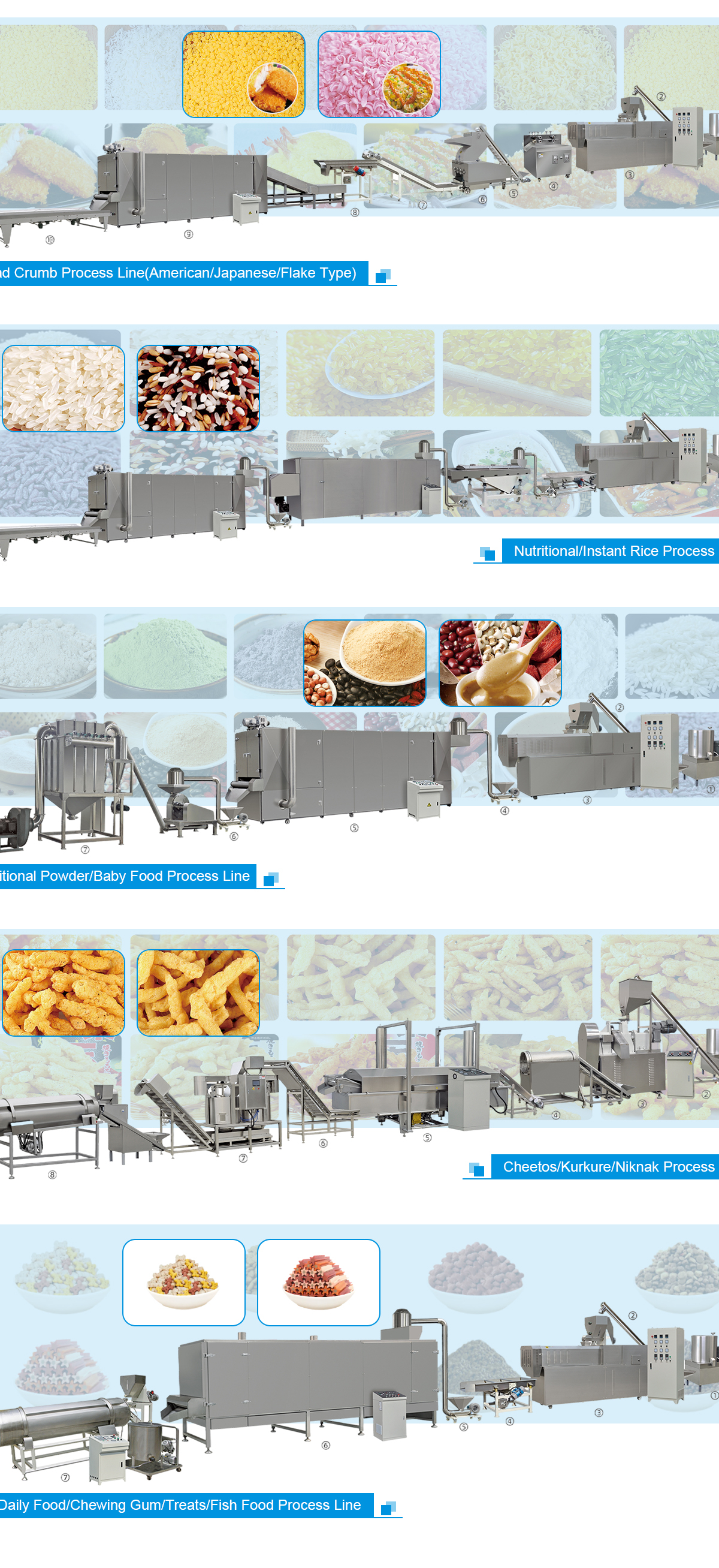 Productos principales:Extrusora de alimentos, máquina hinchada de aperitivos, secador de alimentos, freidora de alimentos, horno industrial